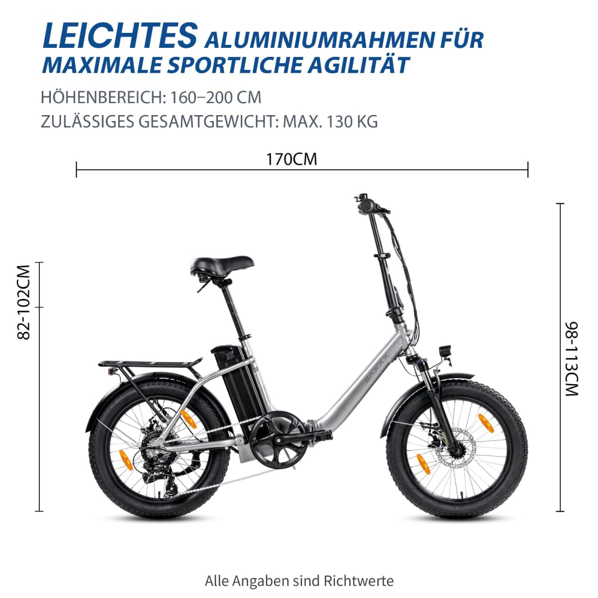 SAXXX E-Bike Klapprad 20 Zoll, 250W Motor, 36V 13Ah Akku, bis 120 km Reichweite, 7-Gang, Scheibenbremsen, faltbares Pedelec Elektrofahrrad Damen Herren
